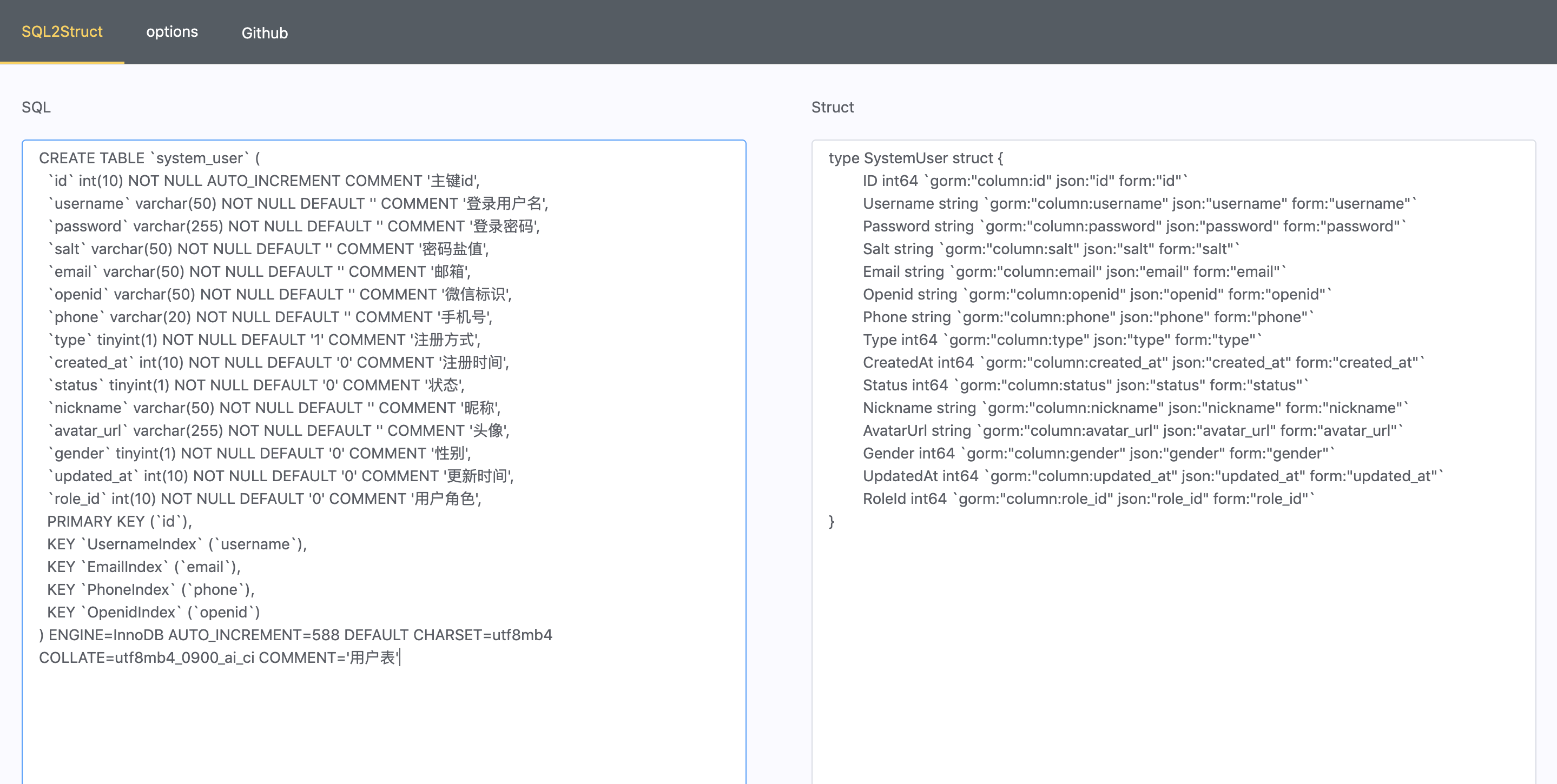 SQL2Struct是一款对golang开发者友好的chrome插件,根据在mysql中创建数据表的sql语句,自动生成golang中的struct,在golang开发者使用诸如gorm之类的框架时,可以很好的把mysql中的数据表与orm的结构体关联起来。