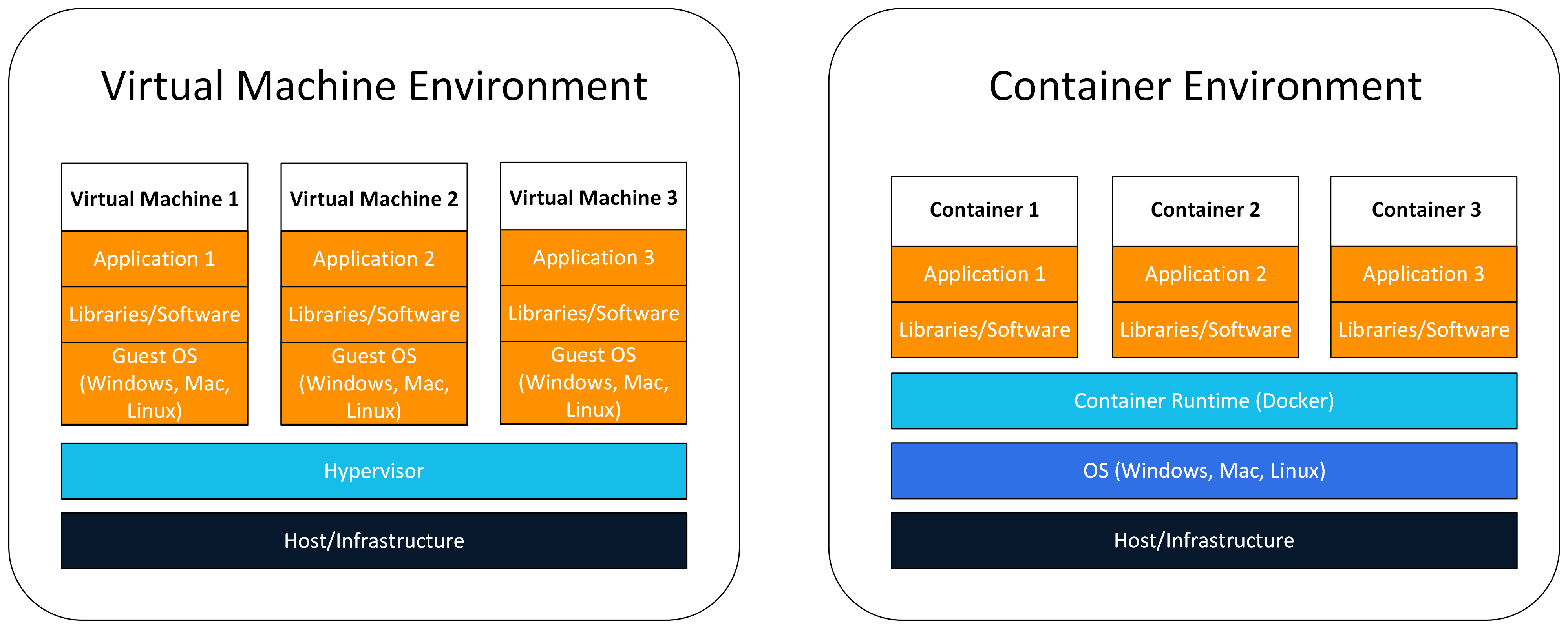 The following diagram shows a virtual machine versus a container environment: