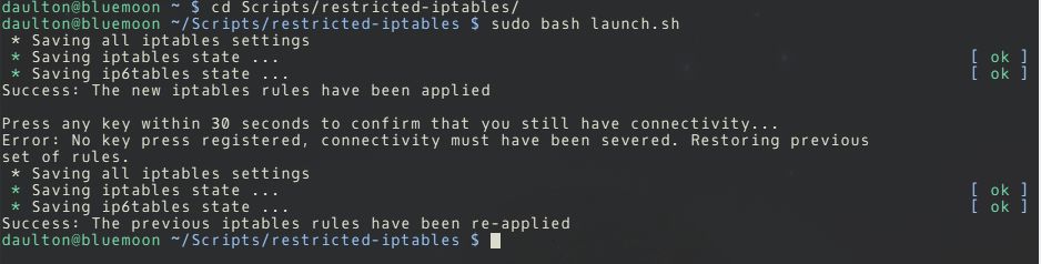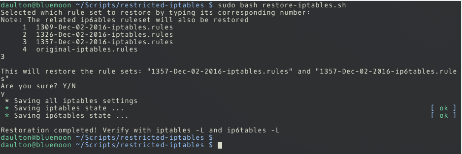 - To restore your old rules launch restore-iptables.sh as such and follow the prompts