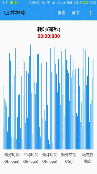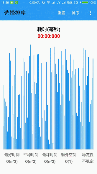 - 界面的初始化由上到下分别为Toolbar菜单栏、主体排序可视窗口、时间复杂度等。