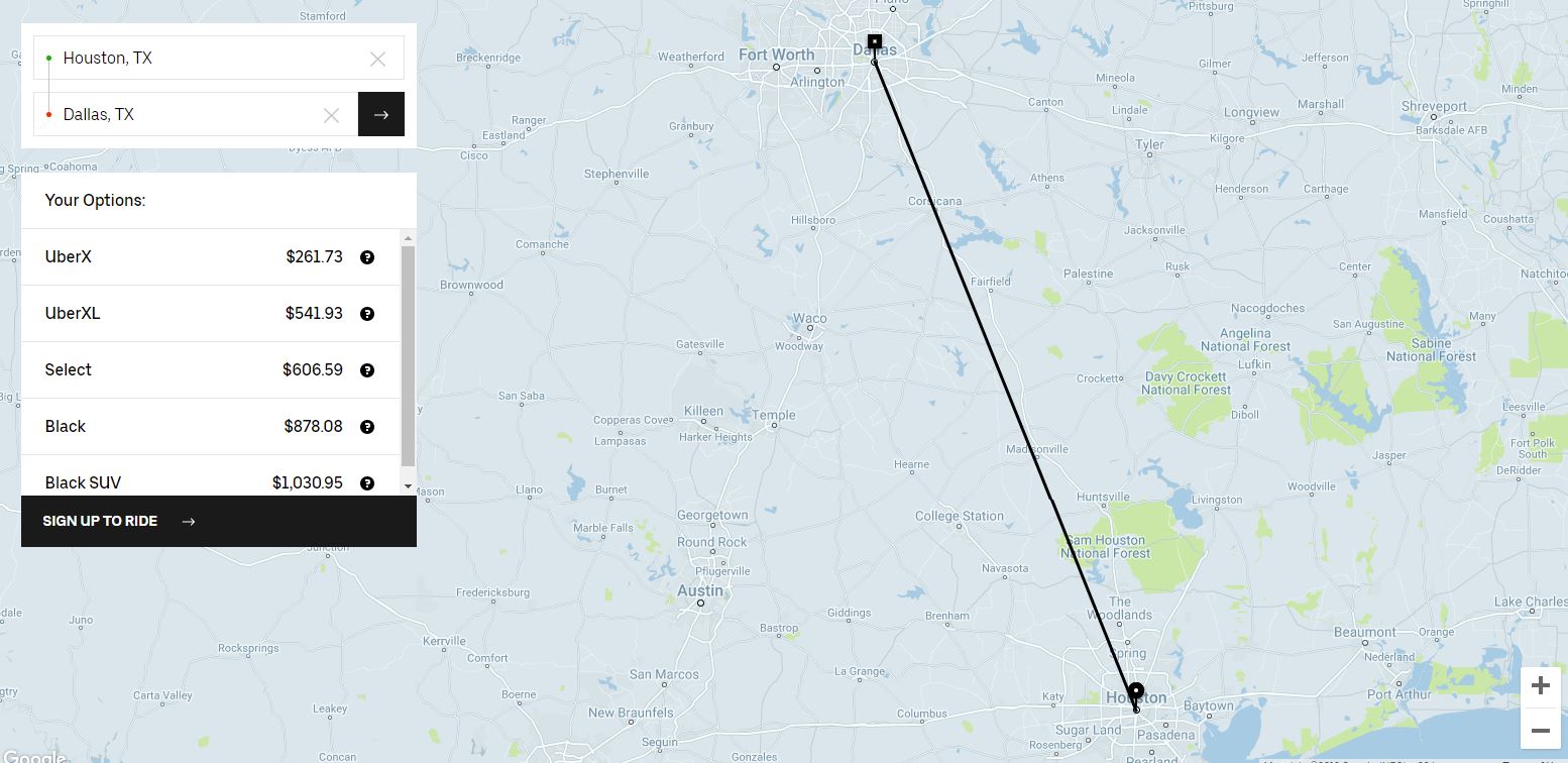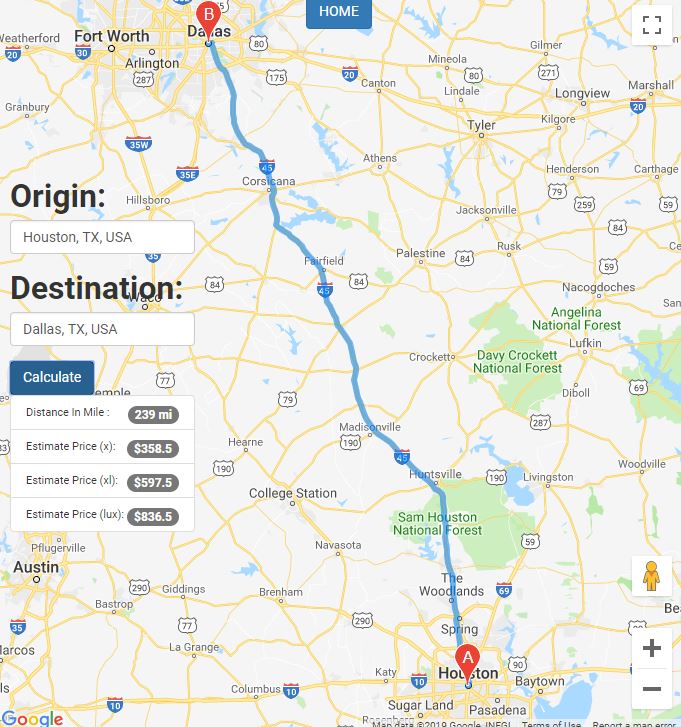 }-Callback function checks for error i.e. addresses typed outside of U.S, an error message will pop up. Calculate distance for 3 service tier (x,xl and lux)