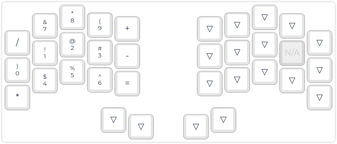 The number layer is accessed by holding the right ring finger. It hosts the numbers and some duplicated symbols that are commonly accessed next to numbers, such as mathematical operators. The number are layed out similarly to a numpad, but with the middle row and the homerow swapped so that the most used numbers: 0, 1, 2 and 3 are all available in homing positions.
