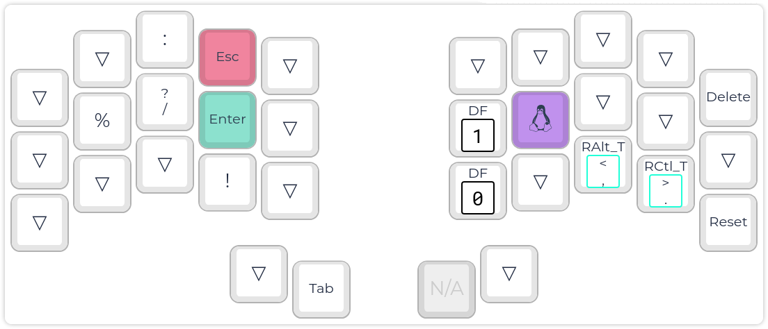 As the layer hosting esc, we duplicated some symbols here to allow for fast navigation in vim. For instance, esc, :, w, q can be done in a single roll.