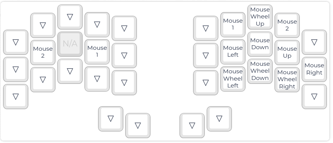 Layer 1 is a mouse layer: it can be used one-handed or two-handed. The most common way to use it is two handed, with left and right click on the homerow of the left hand and directions on the homerow of the right hand. Scrolling is available on the right hand with mid finger up and down for vertical scroll and index and ring finger down for horizontal scroll. On the right hand, left click and right click are also available with index and ring finger up to allow one handed operation. This can be particularly handy when enabling the mouse layer permanently (no need to hold the left middle finger), which can be done from Layer 7.
