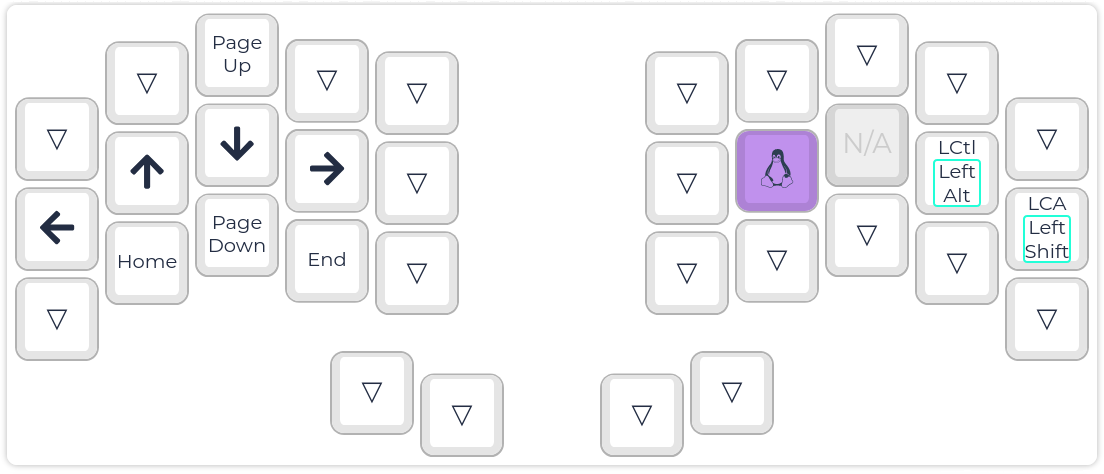 The navigation layer somewhat mirrors the mouse layer. It is accessed by holding the right middle finger and gives access to arrow keys on the left homerow. Page up and down, Home and End mirror the vertical scrolling and horizontal scrolling on the mouse layer.