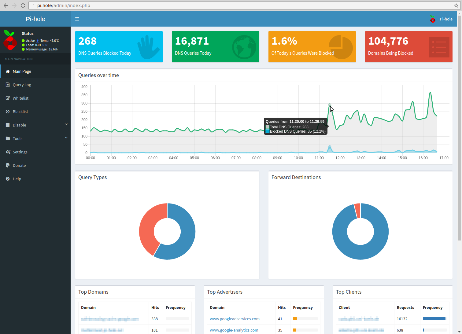 From this interface, you will be able to see stats on how well your Pi-hole is performing. You will also be able to update the lists used to block ads.