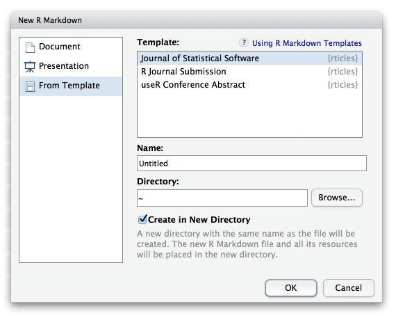 rmarkdown::draft()function to create articles:rmarkdown::draft("MyJSSArticle.Rmd", template = "jss_article", package = "rticles") rmarkdown::draft("MyRJournalArticle", template = "rjournal_article", package = "rticles")