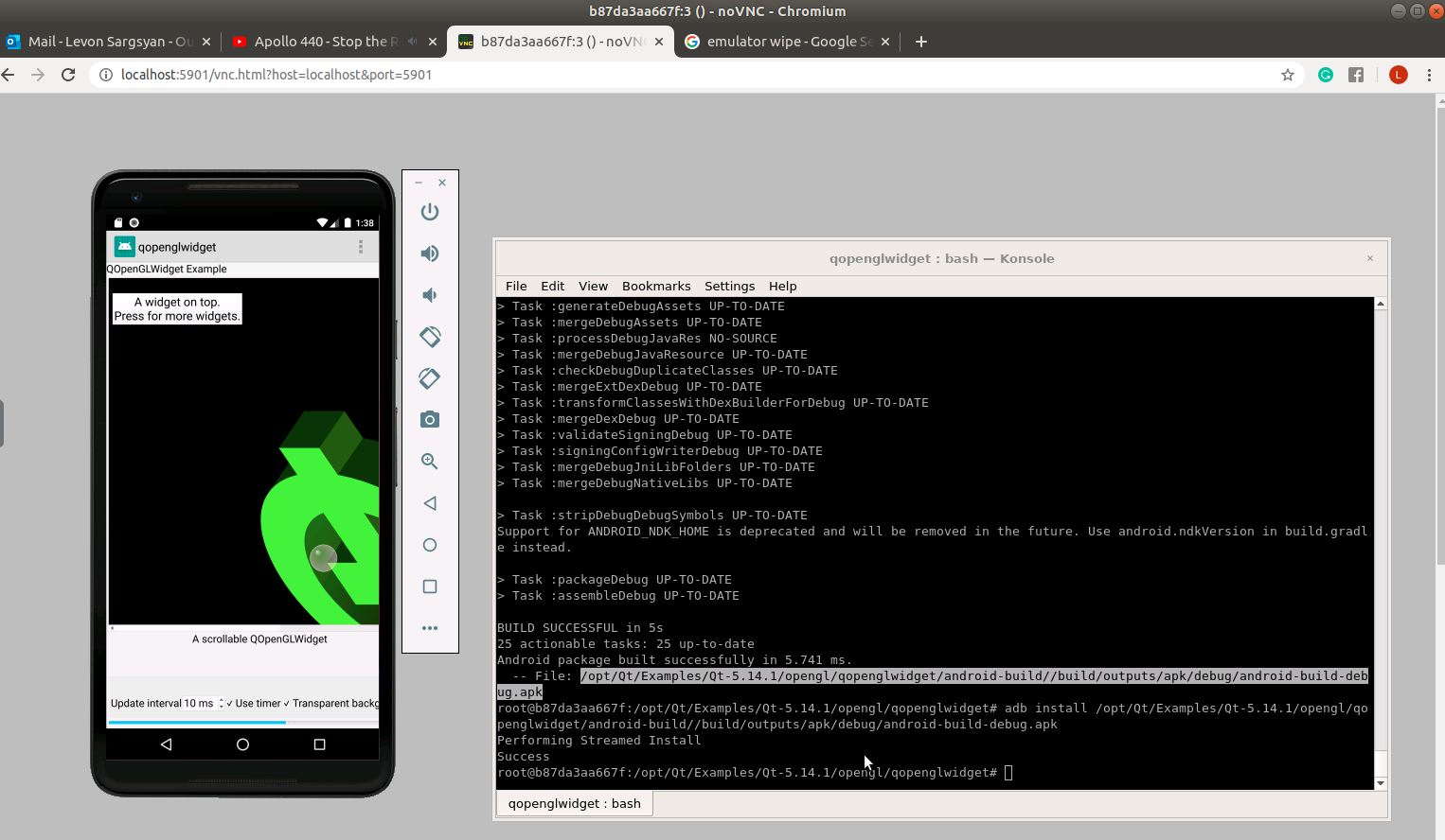 noVNC session in chrome tab showing openGL example running on Android emulator (thats running inside docker container)