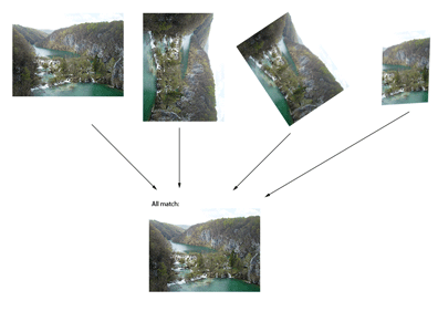 The image comparisons use SURF: Speeded Up Robust Features which is scale, orientation, and to some degree affine invariant.