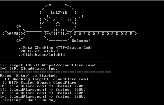 status [Simple] ./Checking HTTP-Status CODE Bypass Cloudflare/UAM and Normal Install: git clone https://github.com/lulzkid/status/ cd status sudo pip install cfscrape sudo pip install requests apt-get install nodejs Usage: python status.py