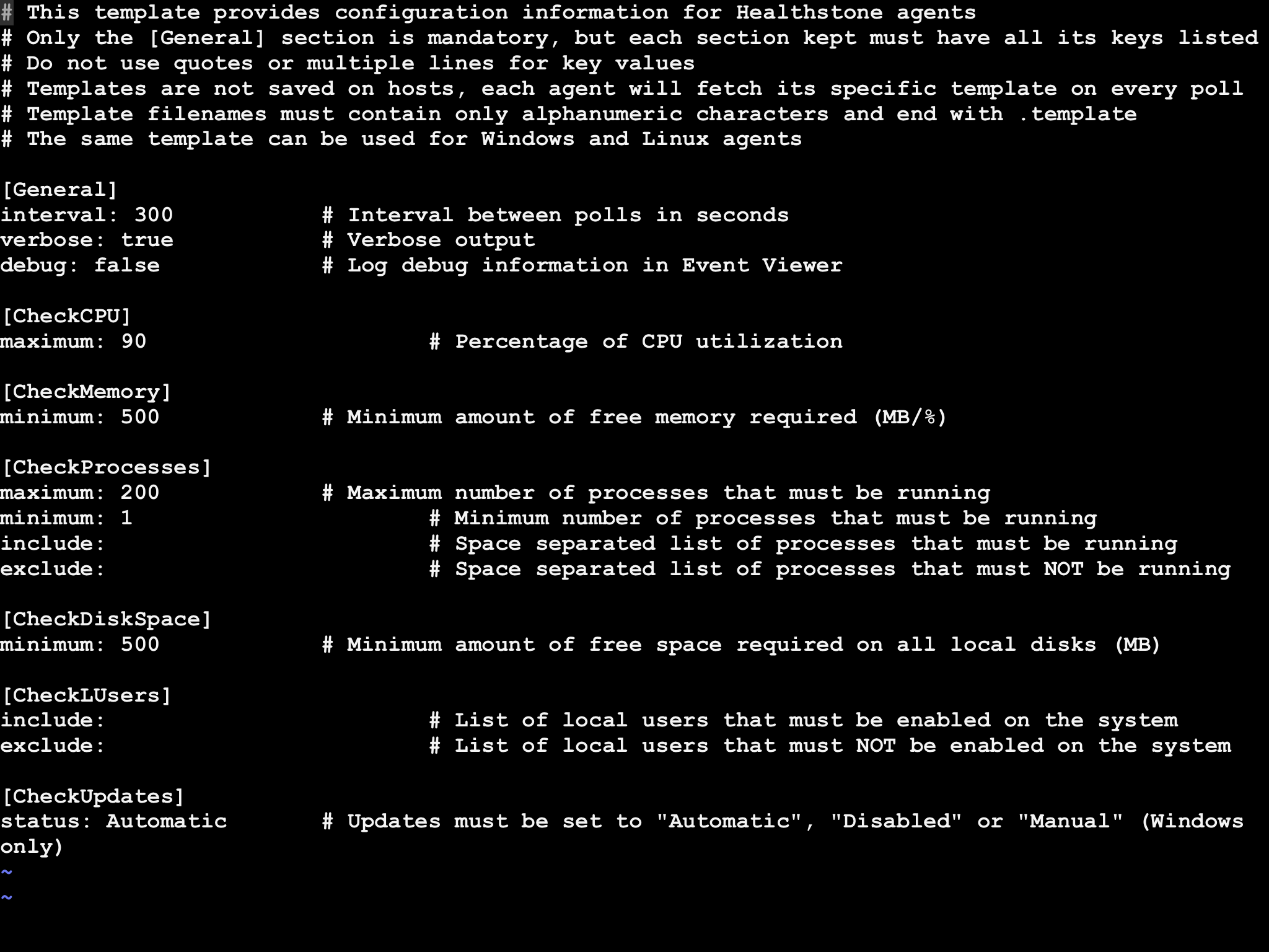 Healthstone is an open source and lightweight system monitoring solution able to run many customizable health checks. It is composed of a dashboard server which runs on a Windows or Linux server, along with agents for Windows and Linux hosts that you wish to monitor. The Windows agent is a binary which runs as a service and connects to this dashboard, while the Linux agent is a Python script doing the same thing. The dashboard can be customized to send you notifications through email, Pushbullet or NodePoint tickets when a client stops checking in, or if any of the configured checks fails. Configuration is retrieved in the form of templates from the dashboard by all agents. Templates are stored in the templates folder and can be customized for your needs.