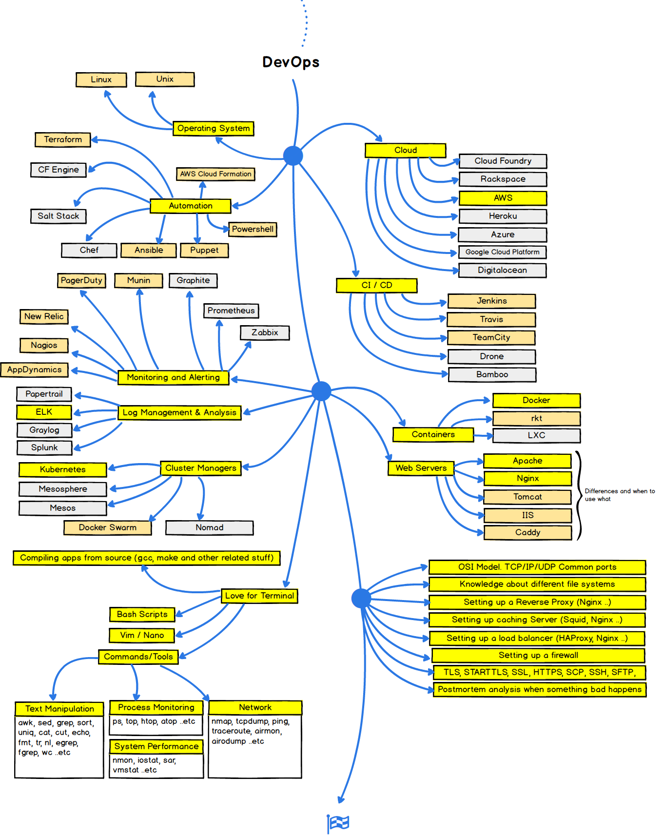 Below you find a set of charts demonstrating the paths that you can take and the technologies that you would want to adopt in order to become a frontend, backend or a devops. I made these charts for an old professor of mine who wanted something to share with his college students to give them a perspective.