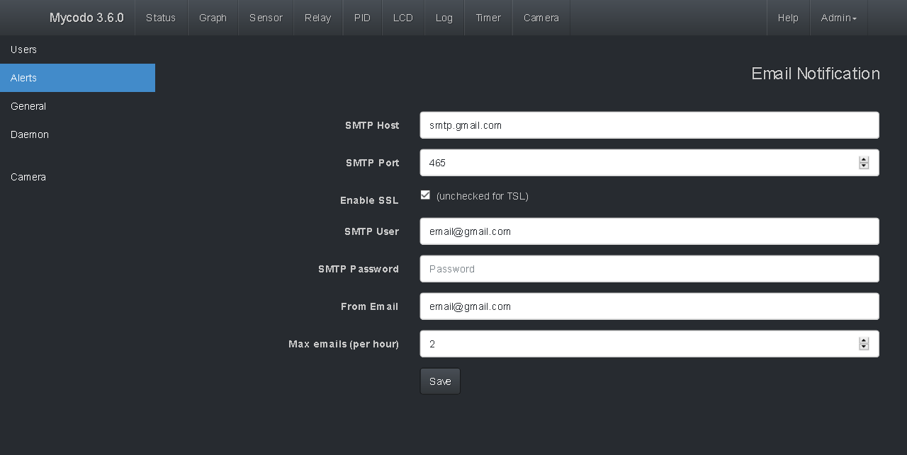 That's it. You should be able to use the user you just created to log into the Mycodo web UI at https://localhost with localhost changed to your Raspberry Pi's hostname or IP address. Once logged in, make sure the Mycodo logo and version number at the top left is green, indicating the daemon is running. Red indicates the daemon is inactive or unresponsive. Ensure any java-blocking plugins are disabled for all the web UI features to work.