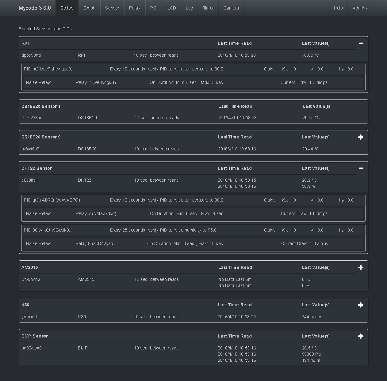 Mycodo is a remote monitoring and automated regulation system with a focus on modulating environmental conditions. It was built to run on the Raspberry Pi (versions Zero, 1, 2, and 3) and aims to be easy to install and set up.