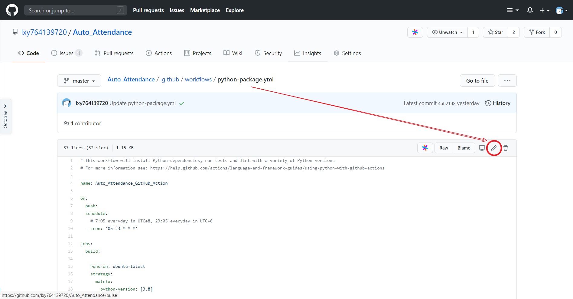 打开项目中的/.github/workflows/python-package.yml文件,修改corn中的值,注意使用UTC零区时间。