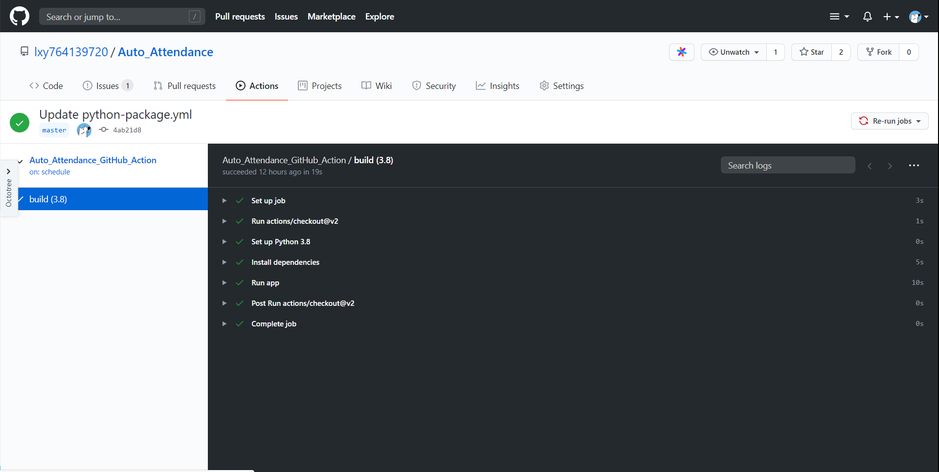 打开Actions页面,此时在workflows中应该出现了正在运行的工作流。当提交文件时会马上进行一次打卡,以后将会默认在每天的7:05进行打卡