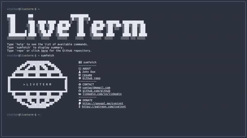 Building a simple website with LiveTerm only takes minutes, and you only need to work with one file: config.json. After you cloned this repository, simply run yarn install && yarn dev and start editing config.json to build your website!