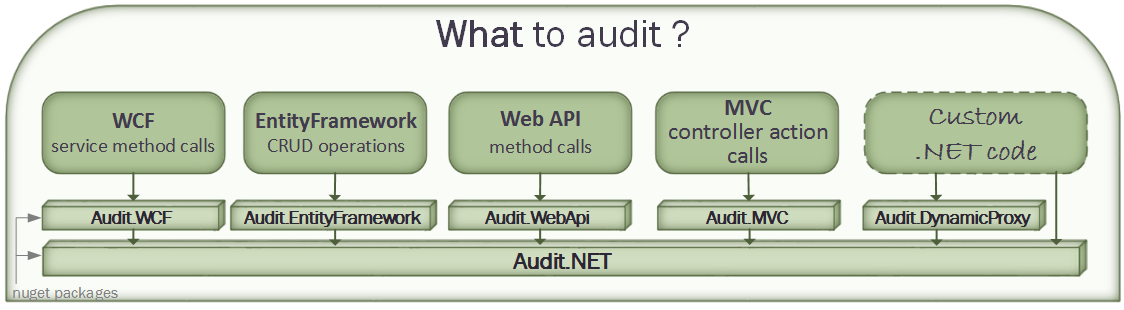 Extensions to log to json Files, Event Log, SQL, MySQL, MongoDB, AzureBlob, DocumentDB and Redis are provided. And also extensions to audit different systems such as Entity Framework, MVC, WebAPI and WCF.