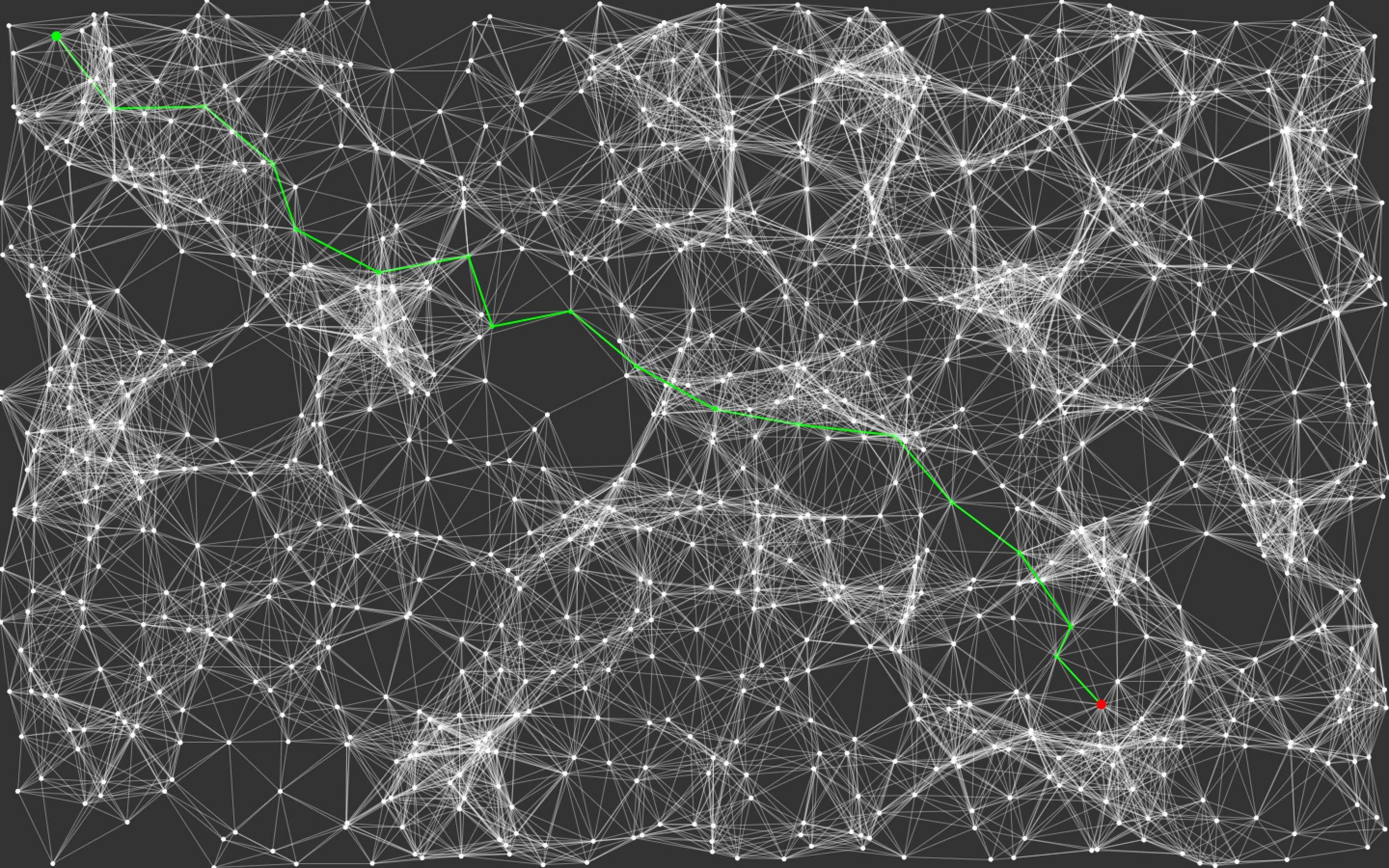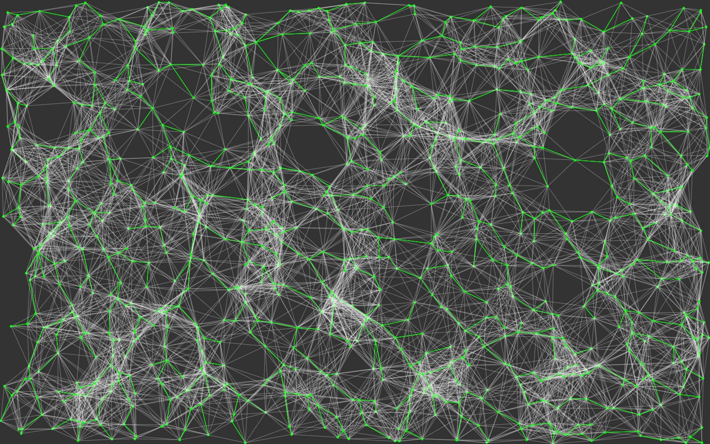 This is slightly more complicated, but just as fun and simple in essence. The program first generates a graph with n nodes (this can also be changed, and is 1000 by default). Unlike the Prim's implementation, these nodes are only connected to the nodes within a 100 pixel radius of them (to make the visual more interesting and more realistic).
