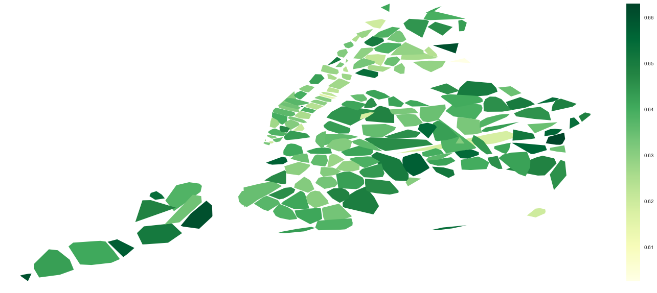 Convex hulls are usually more interpretable than the quadtree, especially when the underlying dataset is relatively small (as this one is). We again see a data nullity distribution that's seemingly at random, giving us confidence that the nullity of collision records is not geographically variable.