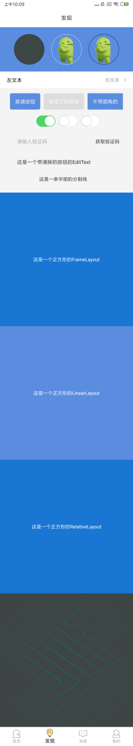• 常用自定义View:圆形ImageView,验证码点击倒计时View,带清除按钮的EditText,正方形的FrameLayout、LinearLayout、RelativeLayout、ImageView
