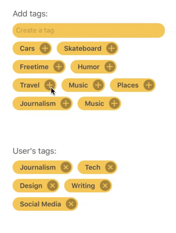 .actionproperty accordingly. For example: if you are in a view displaying a product to which your user has already added some tags, these tags should be removable, hence that collection's action should be.removeAction(more on how to be notified of tags events later).productTagsCollection.action = .removeTag
