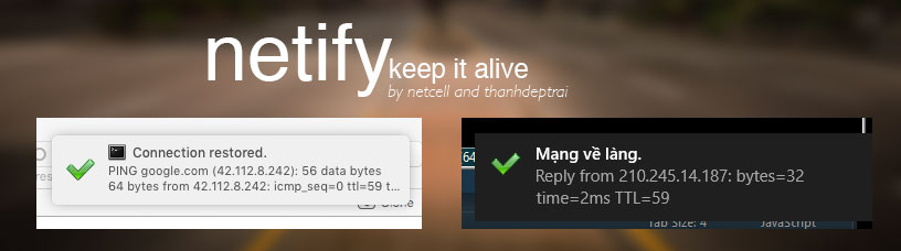 Watch over for internet connection and notify you of its status. This tool is create by netcell and thanhdeptrai.