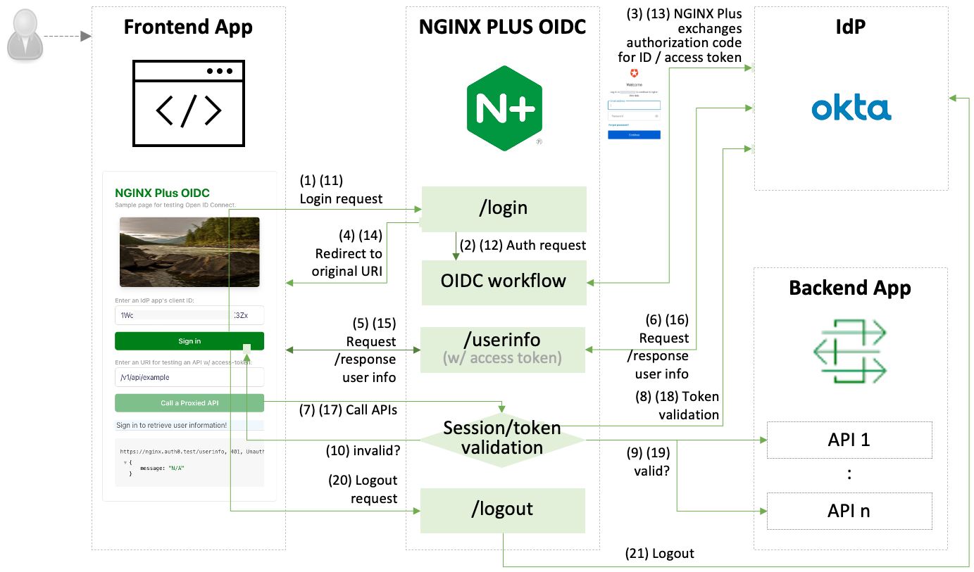 This repo provides the information of how to set up Okta, integrate with NGINX Plus, and locally test using a containerized NGINX Plus app, a frontend OIDC simulation tool, and a NGINX Dev Portal.