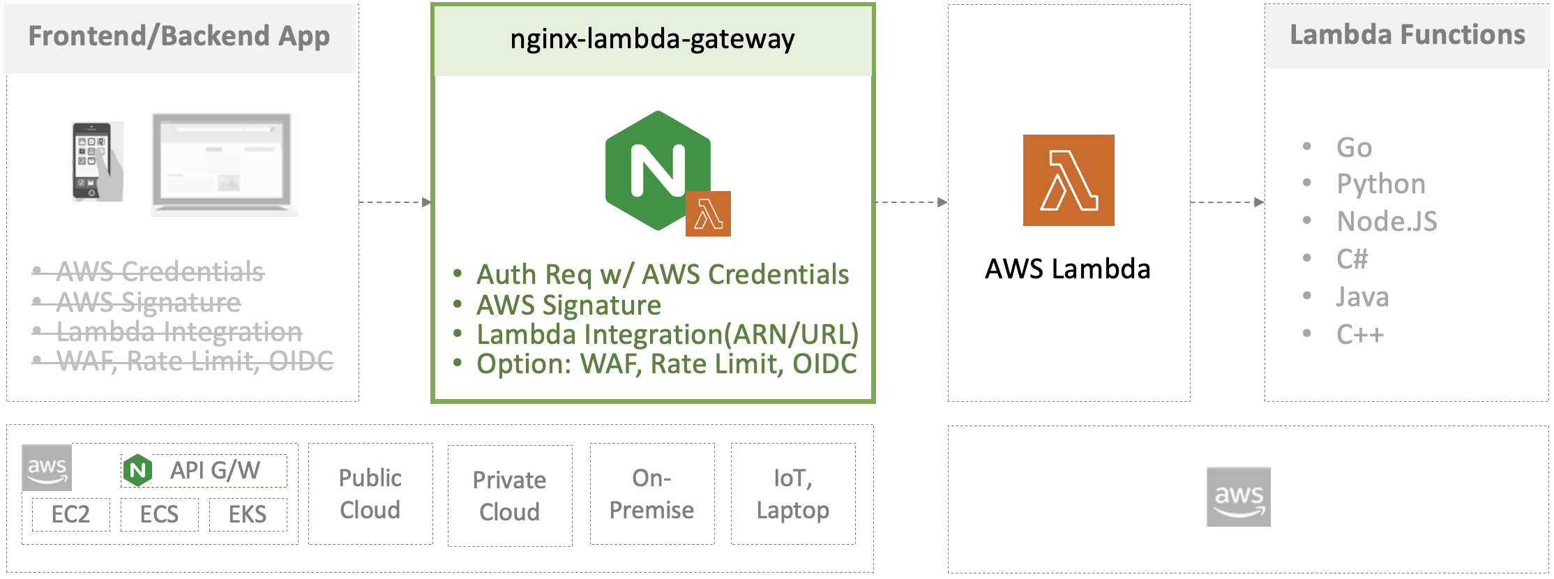 - For internal/micro services that can't authenticate against the AWS Lambda functions (e.g. don't have libraries available) the gateway can provide a means to accessing Lambda functions without authentication