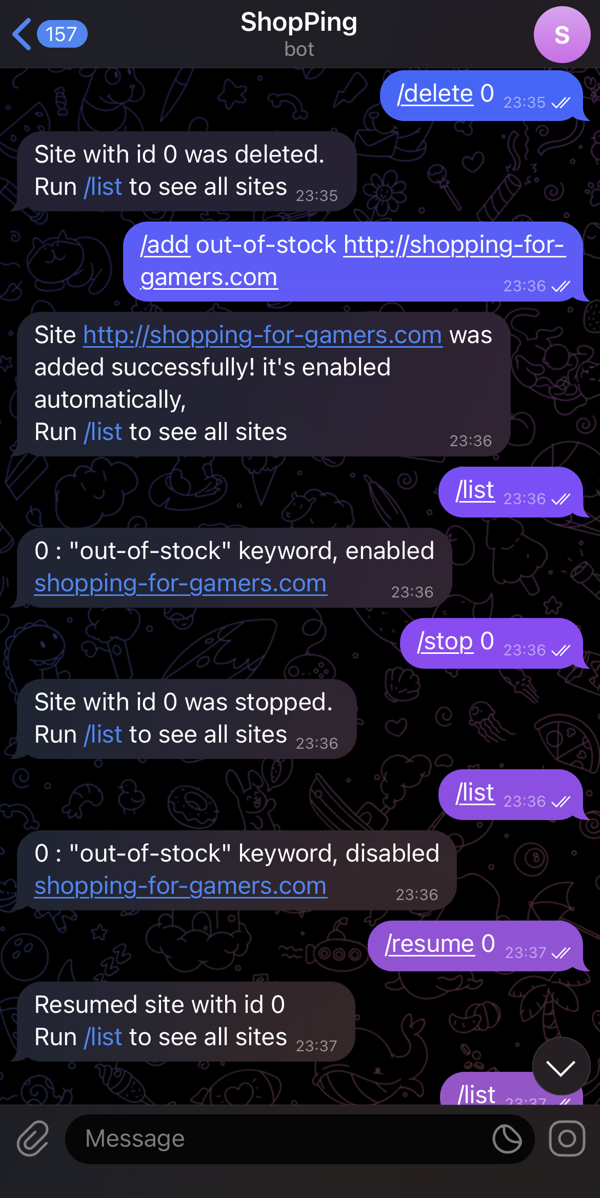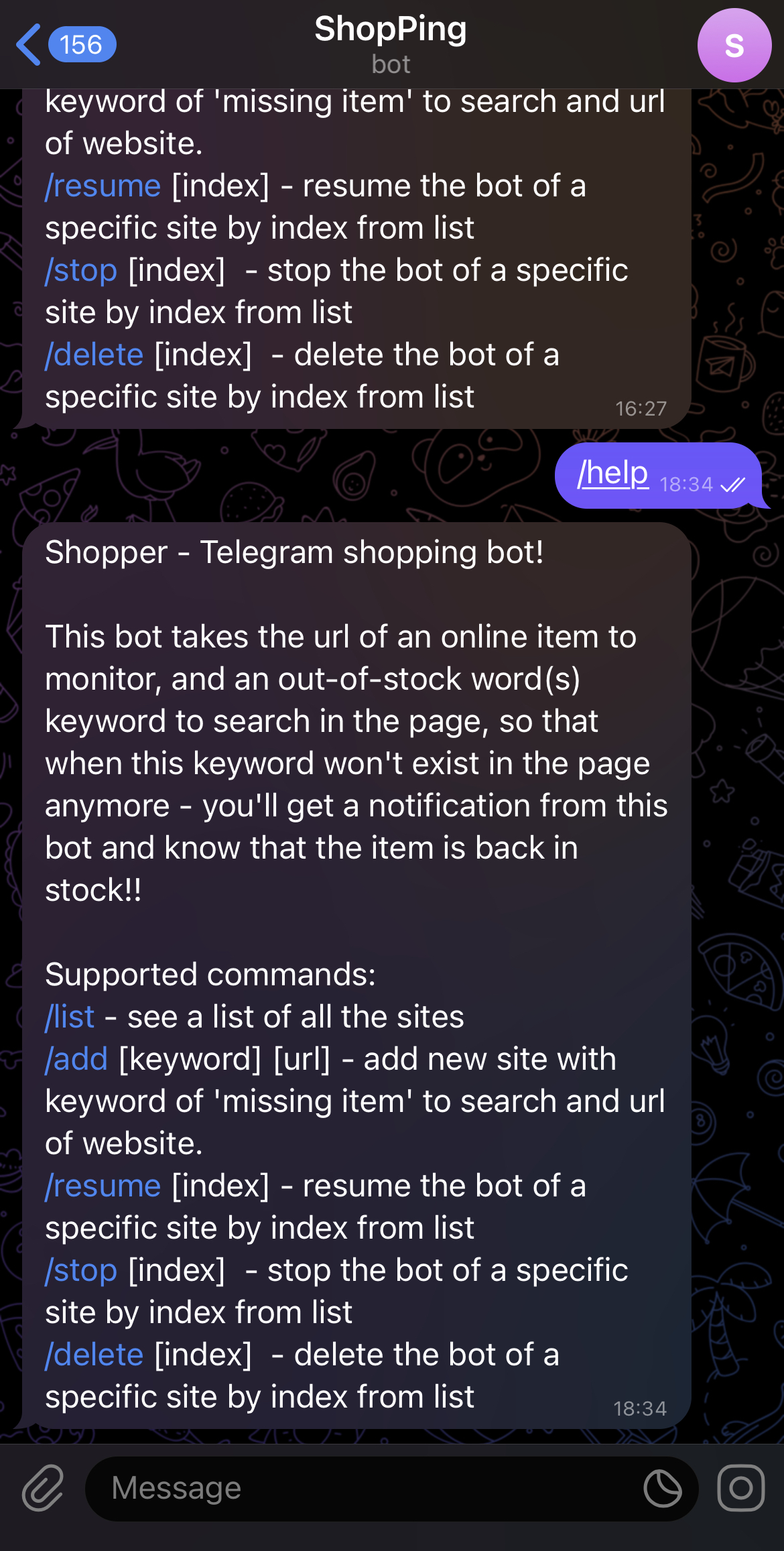 This bot takes the url of an online item to monitor, and an out-of-stock word(s) keyword to search in the page, so that when this keyword won't exist in the page anymore - you'll get a notification from this bot and know that the item is back in stock!!
