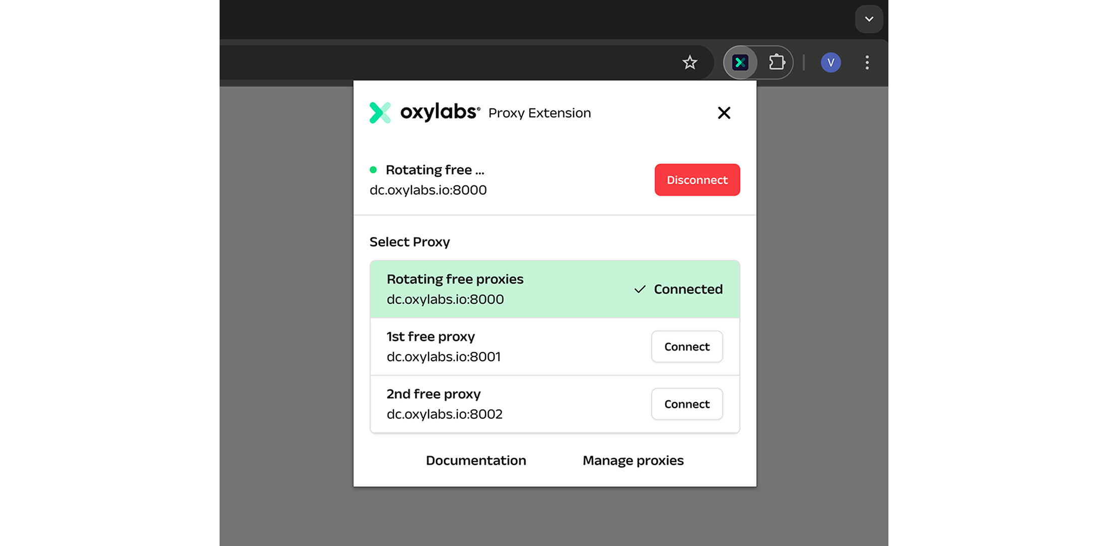 Oxy® Proxy Manager is a free Chrome extension enabling you to easily switch between multiple IP addresses during browsing sessions. See the integration steps to find out more.