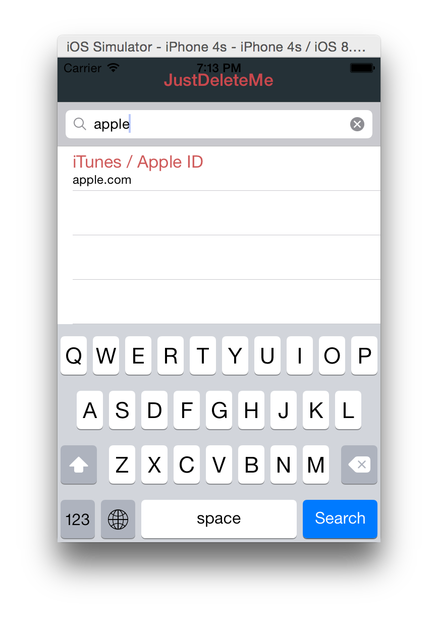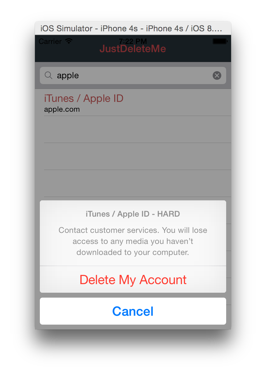 Clicking 'Delete My Account' will open the delete page in Safari, or 'View in App' will search inside the app (pretty useless right now, but I wanted to try out a custom URL scheme):