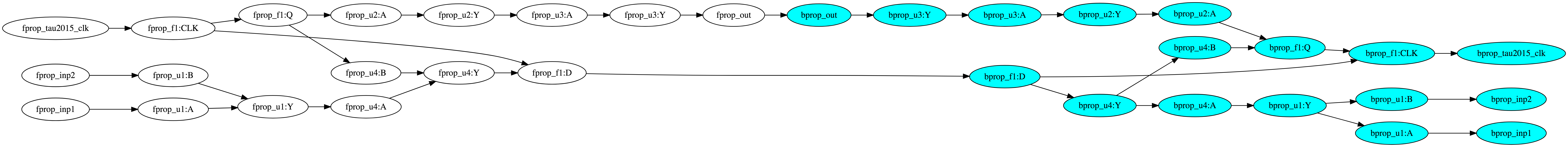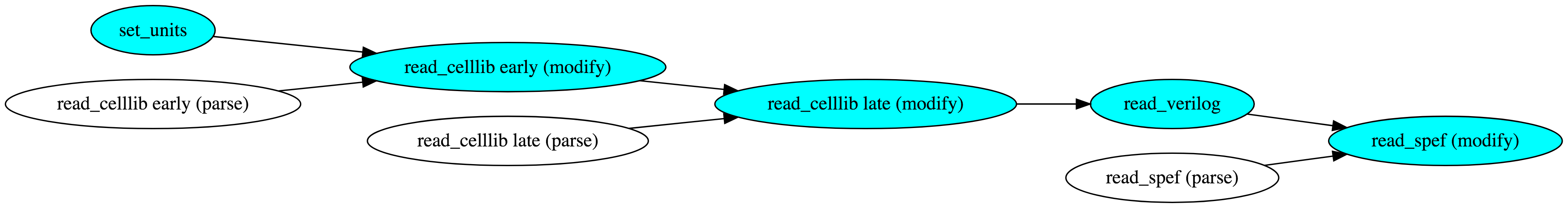 The figure above shows the dependency graph (forward in white, backward in cyan) to update the timing of the simple design. When an action call finishes, it cleans out the lineage graph with all timing up-to-date.