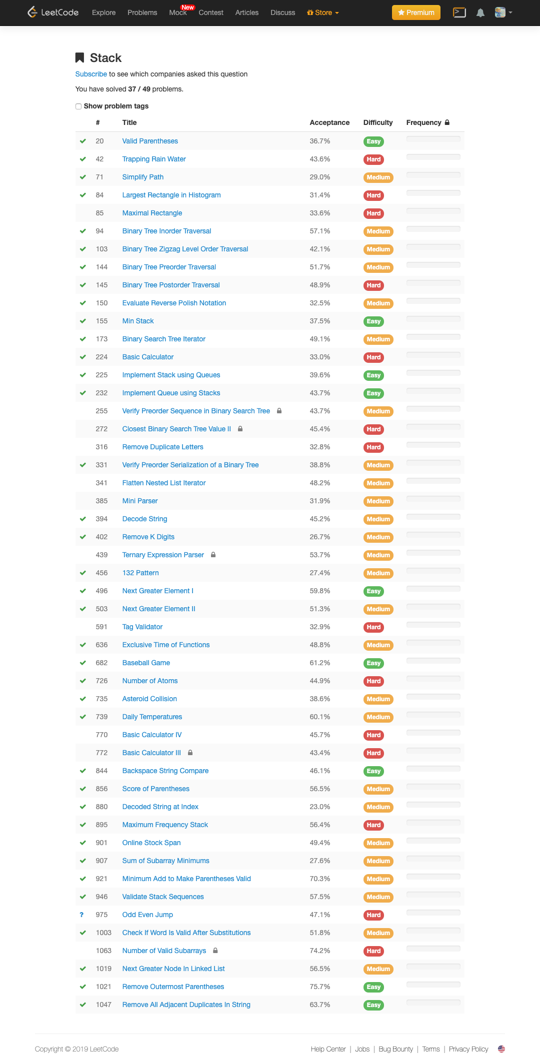 | 0020 | Valid Parentheses | Go | 36.70% | Easy | |