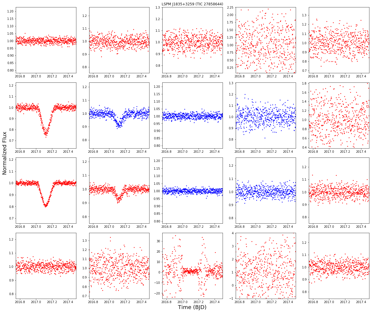 Creates a pixel-by-pixel plot of a tess target from the target pixel file. Subplots in blue are pixels inside the TESS pipeline aperture and those in red are outside it. Note that this code is best used for investigating signals of know duration or period, the plots are small so it is very helpful to know your x_lim before plotting. Note that this may run slowly, especially if a large aperture or padding is used.