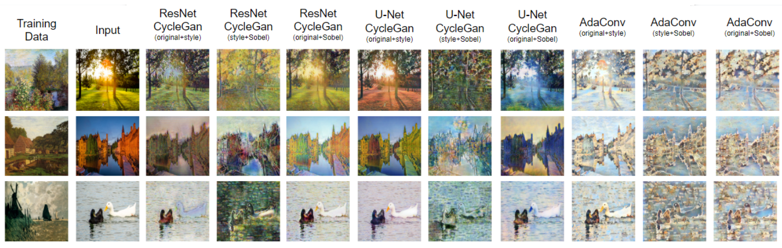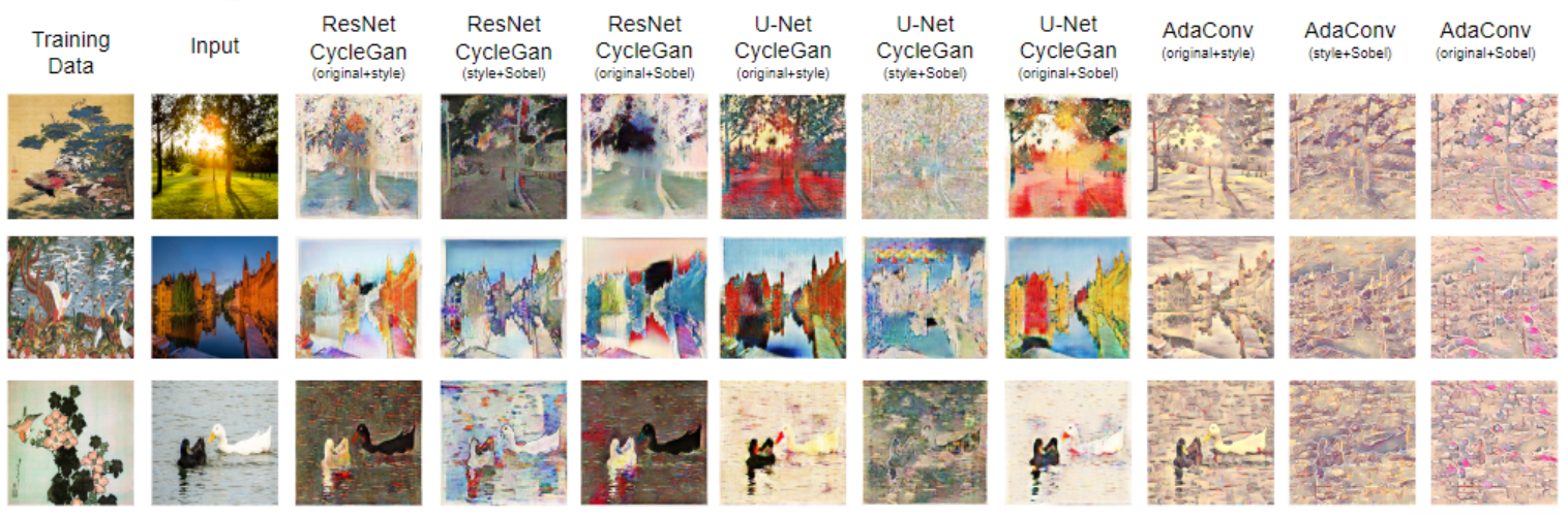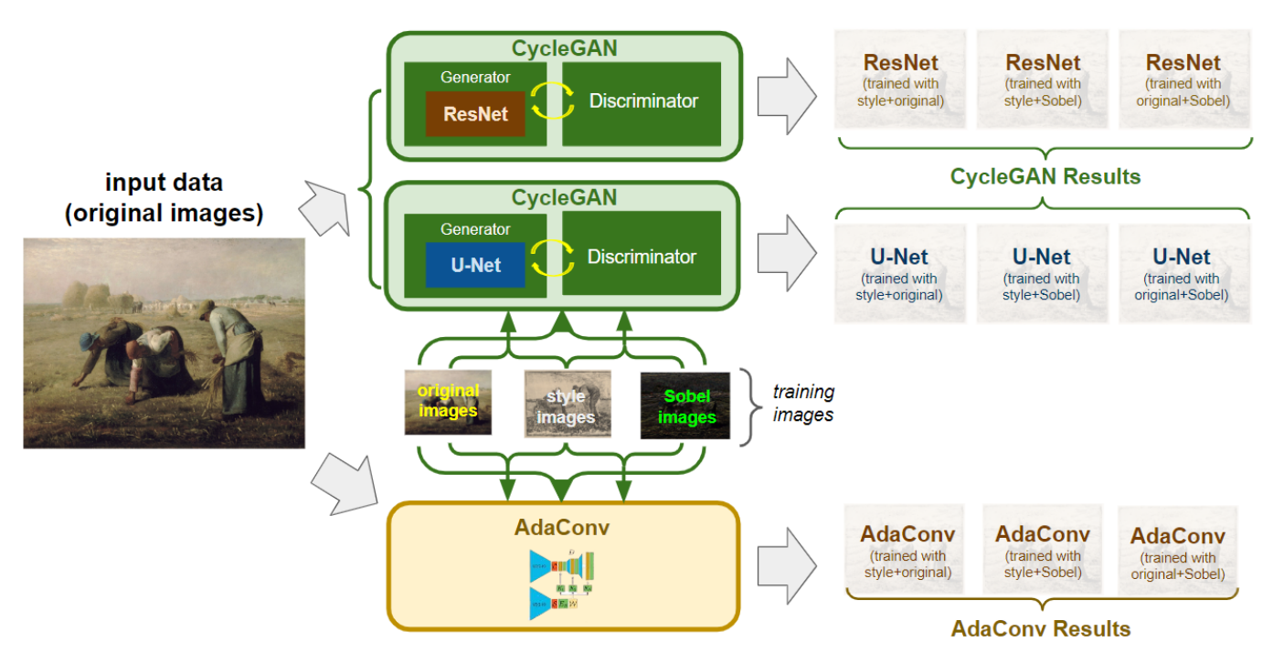 There are several ways to generate new images based on provided samples. Well-known examples include Cycle Generative Adversarial Network (CycleGAN) and Adaptive Convolutions (AdaConv). Previous studies [1, 2] show that the two models have excellent image-to-image translation results. In this study, the two models are fed with different image datasets and are then used to turn real-world images into respective datasets' styles. The generator of CycleGAN is implemented with both ResNet [3] and U-Net [4]. Sobel filters [5] are added on some training data to test the edge detection effects. The results show that for different tasks, certain combinations of training data, models, or model structures outperform others.