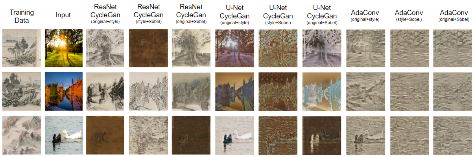 CycleGAN, CycleGAN with Unet as generator, and AdaConv are the three models adopted in this research. The models are trained with Chinese Ink, Monet, and Ukiyo-e paintings and can then be used to turn real-world images (domain X) into respective styles (domain Y).