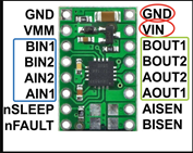 There are 4 input pins (blue) on the driver chip and 4 output pins (green) on the image above. The red ones are used for external power supply. The motors require maximum about 7.2V. So you have to connect such a battery to the GND and VIN pins of this chip. The input pins should be connected to BBB. Please follow the picture below for how to connect the input pins of Pololu with BBB: