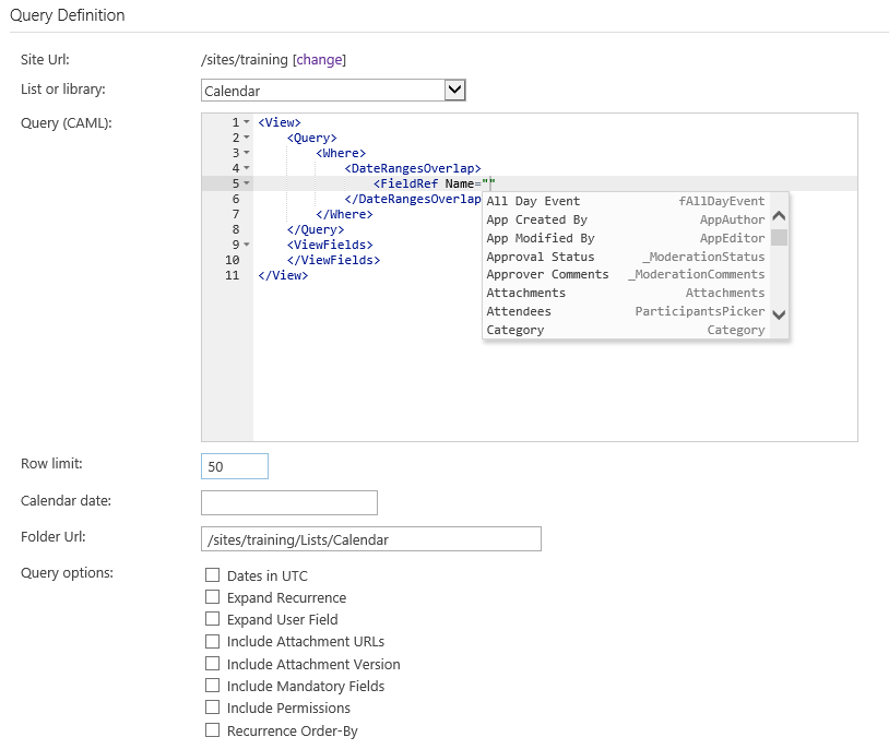 And as a code-oriented tool, a key feature is the intellisense support! This tool provides context-sensitive suggestions for tag names, attribute names, and attribute values (including list field names where appropriate!).