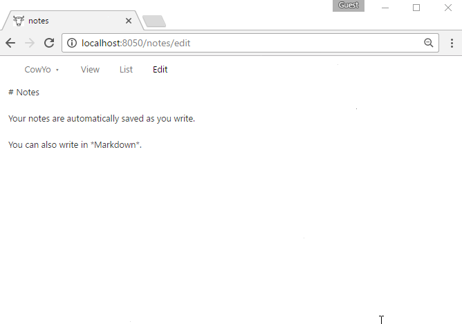 When you open a document you'll be directed to an alliterative animal (which is supposed to be easy to remember). You can write in Markdown. Saving is performed as soon as you stop writing. You can easily link pages using [[PageName]] as you edit.
