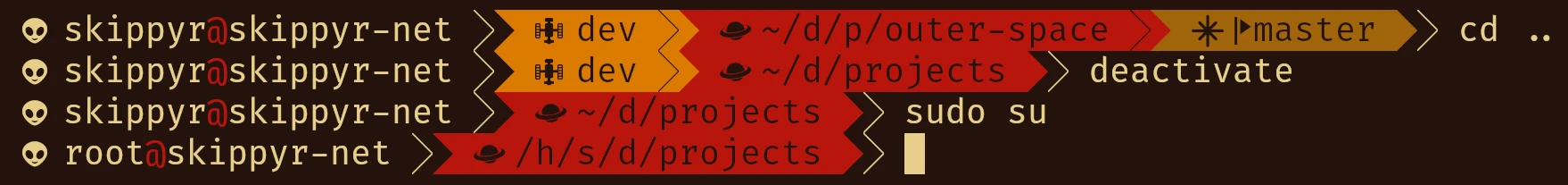 A powerline theme for the zsh shell for Linux that has an outer space thematic.