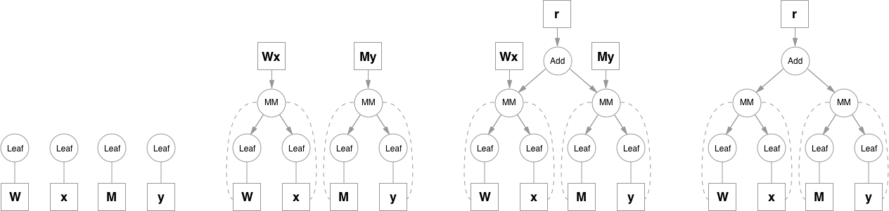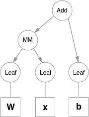 Functions are simple classes that define a function from a tuple of inputs to a tuple of outputs, and a formula for computing gradient w.r.t. it's inputs. Function objects are instantiated to hold references to other functions, and these references allow to reconstruct the history of a computation. An example graph for a linear layer (Wx + b) is shown below.