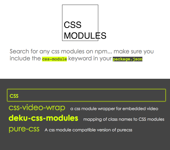 cssmodul.es site for cssmodul.es and cssmodules.com Uses css modules, react, redux and isomorphic-fetch to query npm packages with the css-module keyword Run Dev npm install npm run dev open http://localhost:3000 Run Prod npm install npm run site open http://localhost:3000 License MIT