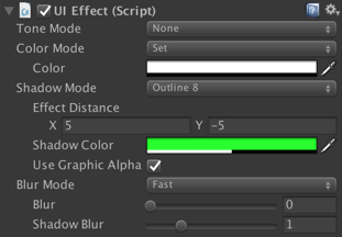 UIEffectcomponent to UI element (Image, RawImage, Text, etc...) fromAdd Componentin inspector. - Choose effect type and adjust values in inspector.