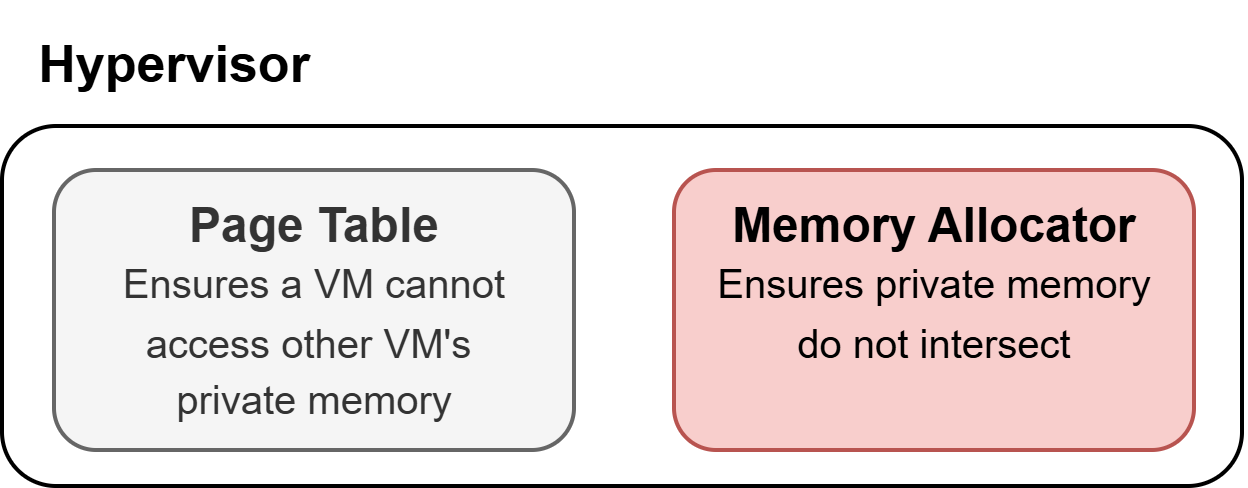 In a Type-I Hypervisor, the memory allocator is responsible for assigning non-overlapping physical page ranges to different VMs. It collaborates with the page table to achieve strong isolation and verifiable security: