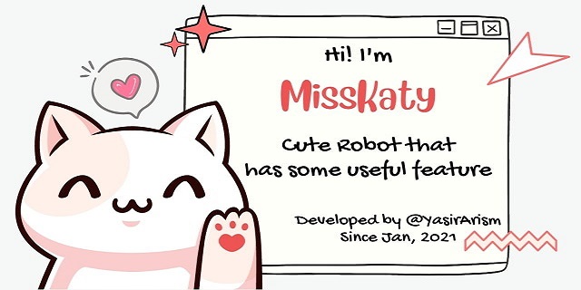 MissKaty is a Telegram Bot built using Python and the Pyrogram library. Many useful features for us to use. I hope that one day this project will be discontinued, someone will continue or develop it again. I gave the name MissKaty because I like cats, a cute animal that likes to be played with and friendly with humans.