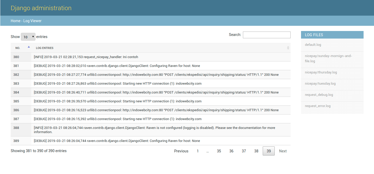 LOG_VIEWER_FILES = ['logfile1', 'logfile2', ...] LOG_VIEWER_FILES_DIR = os.path.join(BASE_DIR, '../logs') LOG_VIEWER_MAX_READ_LINES = 1000 # total log lines will be read LOG_VIEWER_PAGE_LENGTH = 25 # total log lines per-page # Optionally you can set the next variables in order to customize the admin: LOG_VIEWER_FILE_LIST_TITLE = "Custom title" LOG_VIEWER_FILE_LIST_STYLES = "/static/css/my-custom.css"