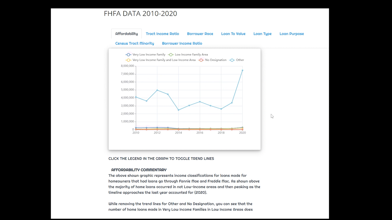 The web application has 8 tabs with graphs and commentary associated with each. This commentary provides an explanation of the metrics selected as well as some light interpretion the data relative to the intended use of the web application. The graph plot has been selected to allow the user an interactive interface refining the graph by selectung multple categories for viewing with toggles shown at the top of each graph. This provides a better data visualization experience and allows for maximum information communicated to the user using current technology.