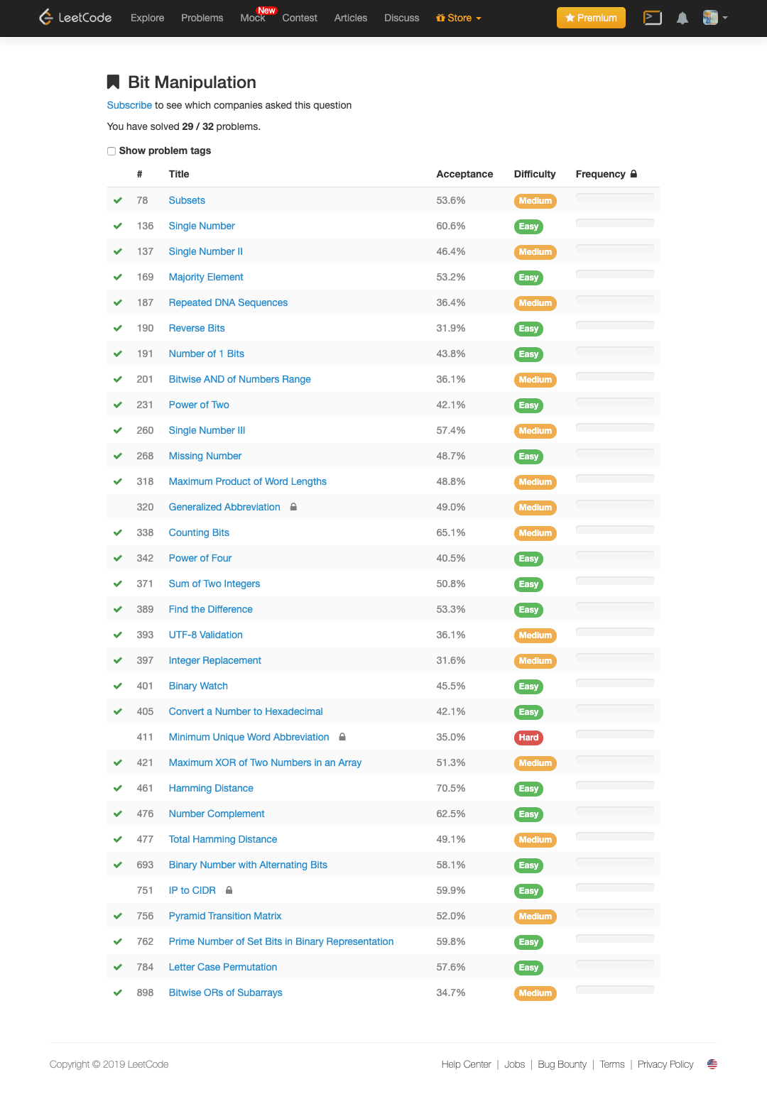 • 异或的特性。第 136 题,第 268 题,第 389 题,第 421 题,