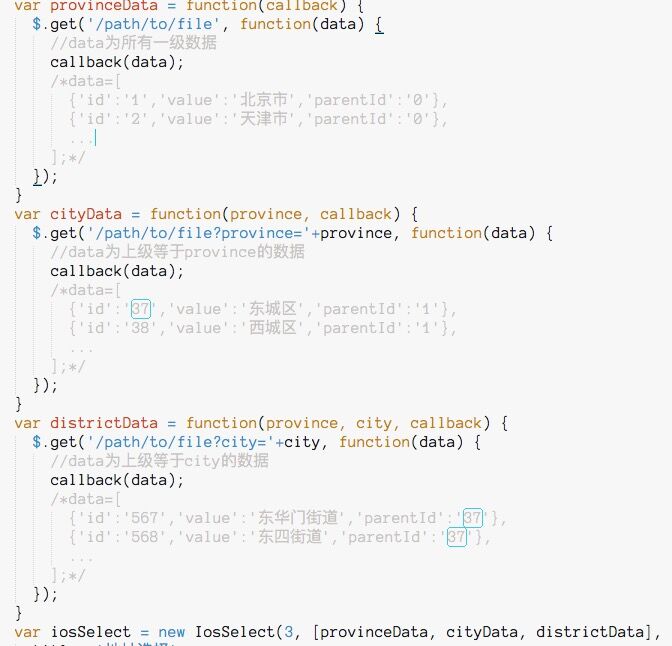 var example = new IosSelect(1, // 第一个参数为级联层级,演示为1